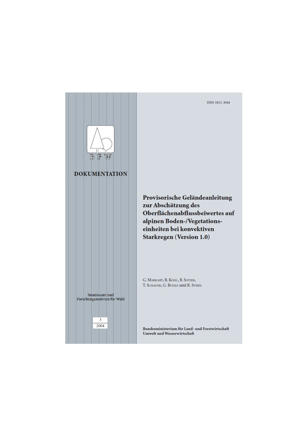 Markart G., Kohl B., Sotier B., Schauer T., Bunza G., Stern R.: Provisorische Geländeanleitung zur Abschätzung des Oberflächenabflussbeiwertes auf alpinen Boden-/Vegetationseinheiten bei konvektiven Starkregen (Version 1.0). 2004. 83 S.