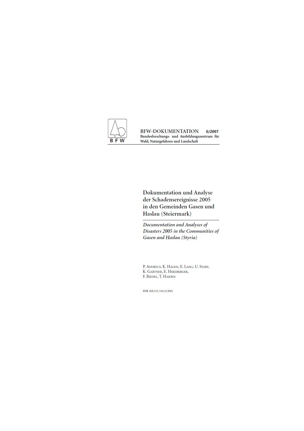 Andrecs P., Hagen K., Lang E., Stary U., Gartner K., Herzberger E., Riedel F., Haiden T.: Dokumentation und Analyse der Schadensereignisse 2005 in den Gemeinden Gasen und Haslau (Steiermark). 2007. 75 S.