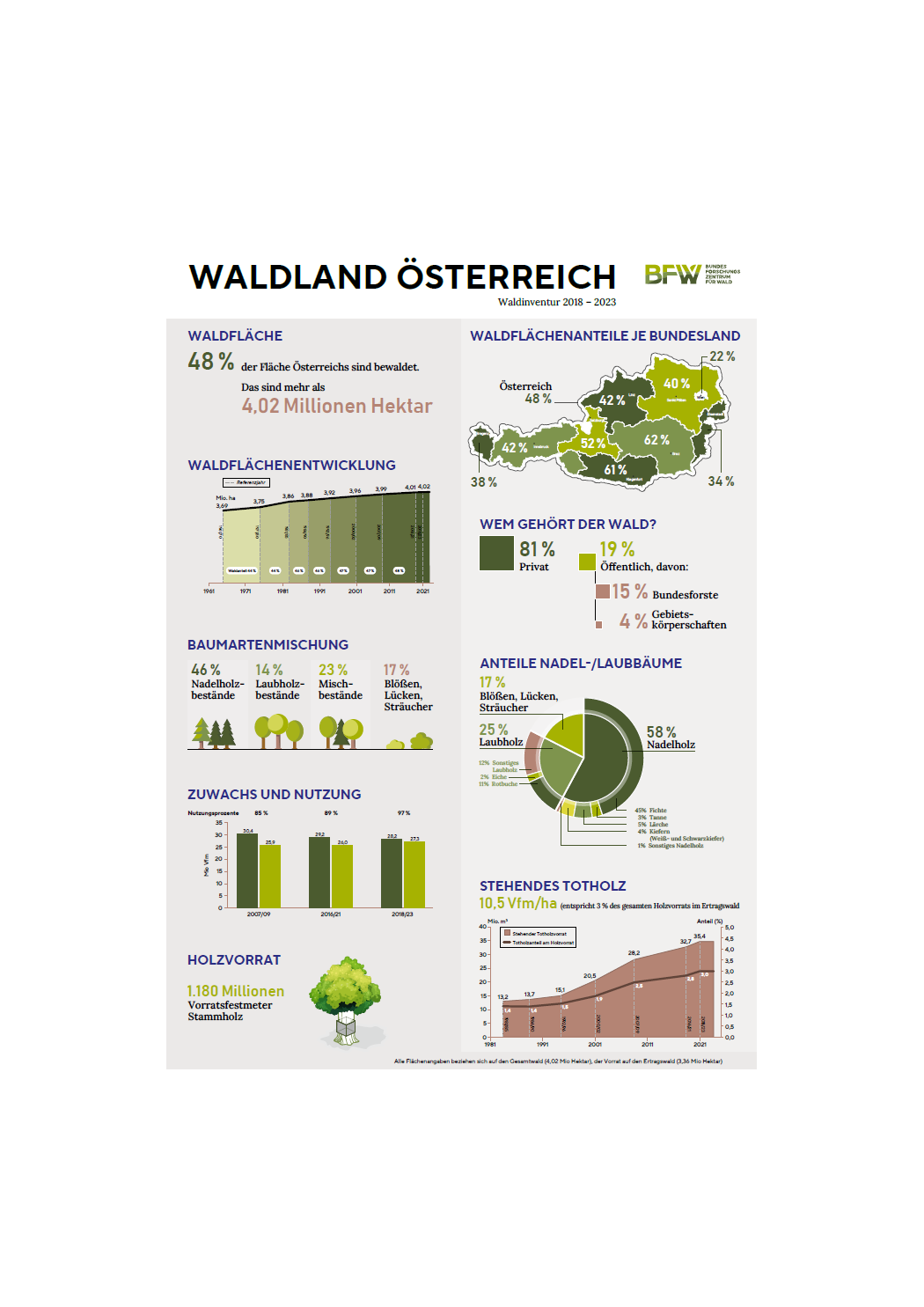Das Poster "Waldland Österreich" bietet einen Überblick über die erfassten Daten der Waldinventur der Periode 2018 - 2023 und behandelt die Waldfläche Österreichs, Waldflächenanteile, die Waldflächenentwicklung, Waldbesitz, Baumartenmischung, Anteile Laub- und Nadelbäume, Zuwachs und Nutzung, Totholz und Holzvorrat.